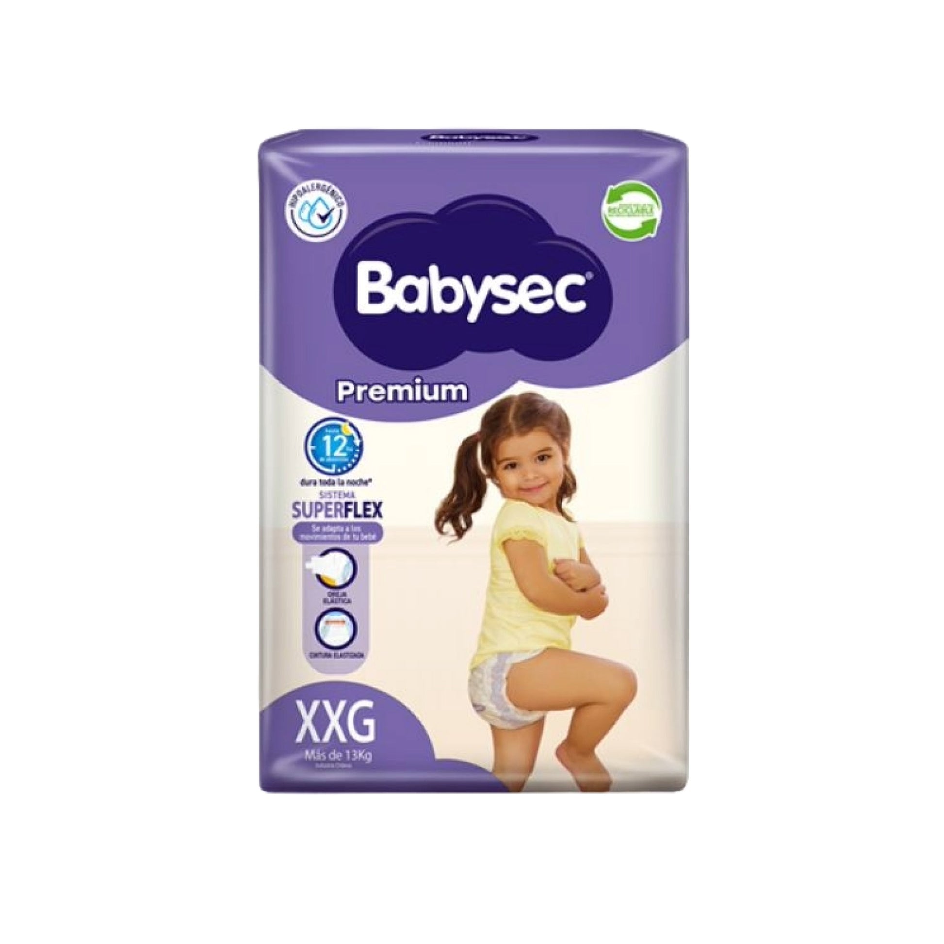 - Babysec Premium es un pañal hipoalergénico y le entrega a tu bebé hasta 12 horas de absorción, manteniendo su piel seca.
